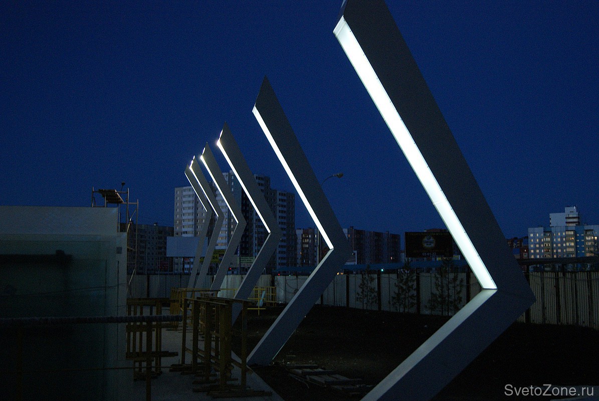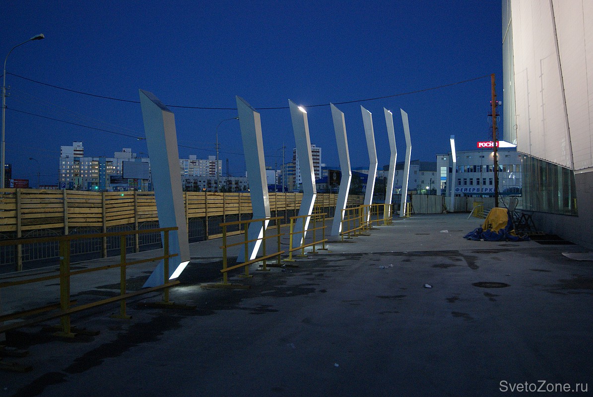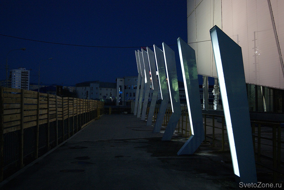 Идея разместить по двум главным фасадам торгового центра «Вершина» опоры освещения вполне логична и обоснована, встречается во многих проектах и инсталляциях, на первый взгляд, ничего обычного – все должно быть обыденно и просто.