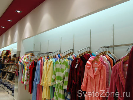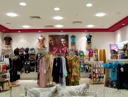 И не последнюю роль в создании комфортной атмосферы в зале играет правильно расставленные световые акценты. Эффект легкого и открытого пространства придают встроенные светильники Hony E и Mony T/E под компактную люминесцентную лампу. Интересное цветовое и конструктивное решение потолка подчеркивают встраиваемые светильники DO CDM-T B1 под металлогалогенную лампу, которые выполняют сразу 2 функции: выделяют обрамление потолка и акцентируют внимание на различных коллекциях.