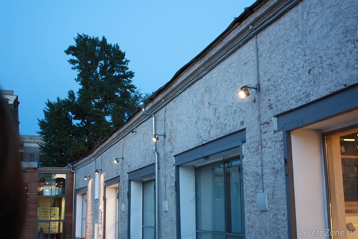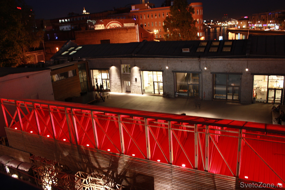 Архитектурно-художественная подсветка выполнена светодиодными прожекторами Quadrus LED с белыми и красными светодиодами.