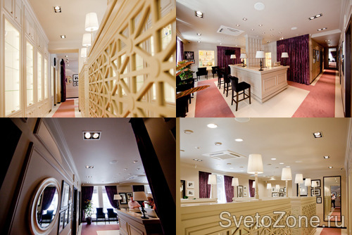 Освещения салона красоты ОСОБА реализовано на двух типах источников света. Общественные зоны, зона встречи посетителей и коридоры освещены двумя типами галогенных светильников. Рабочие и офисные зоны освещены люминесцентными светильниками, т. к. люминесцентные источники света (особенно линейные)не создают бликов и обеспечивают максимально комфортные условия для работы стилистов и парикмахеров.