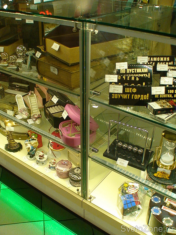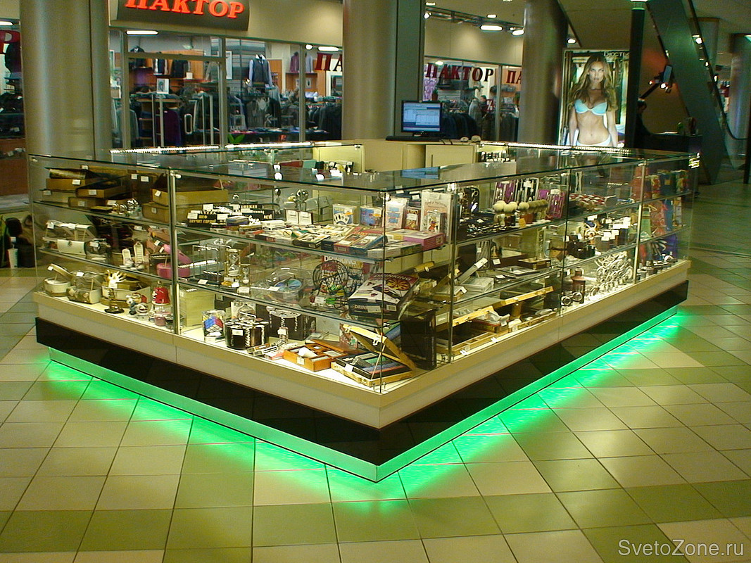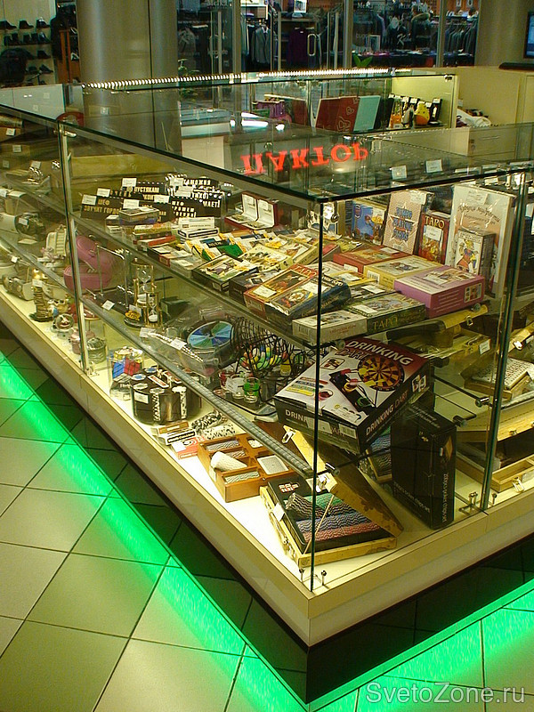 Магазин оснащен светильниками производства Просвет ООО. Привлекает внимание покупателей результат от освещения незаметных светодиодных светильников и зеленая подсветка цоколя витрин |