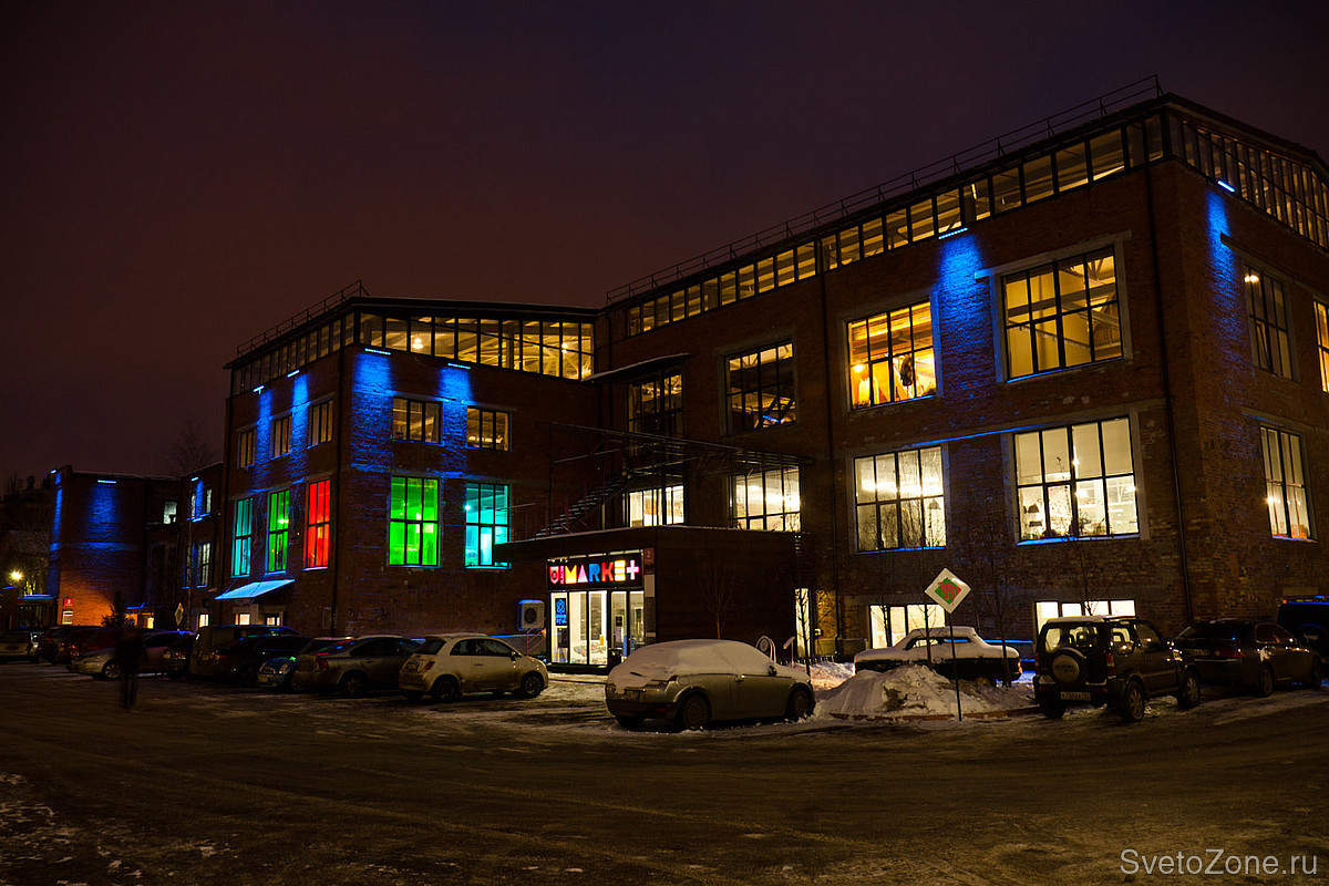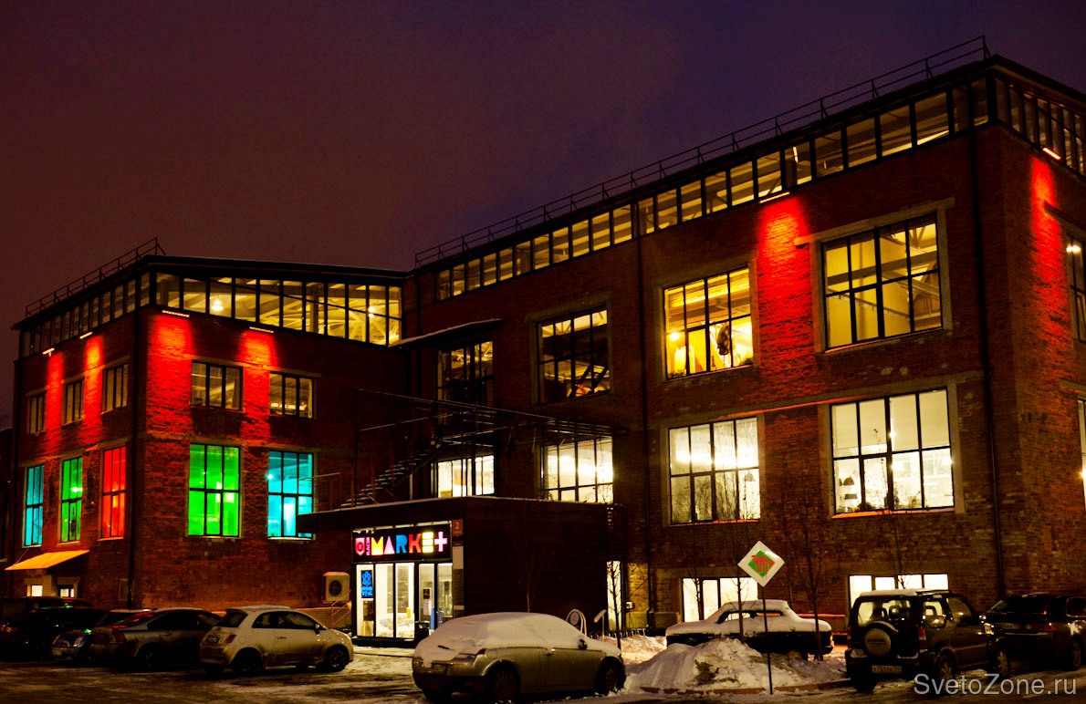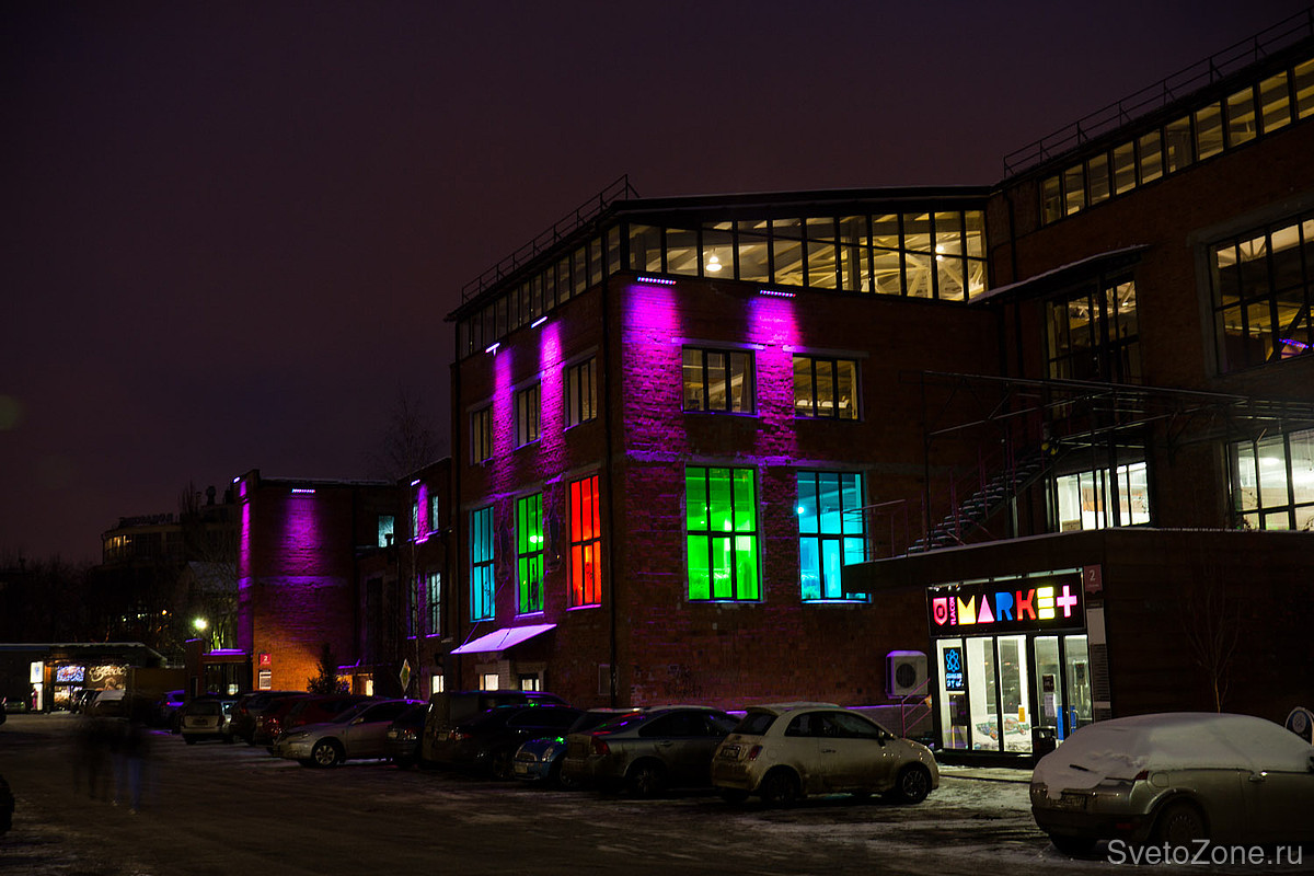 Конечно, такое креативное место должно быть оригинальным и привлекать внимание. Для решения этой задачи администрация Дизайн-завода обратилась к специалистам компании ”МДМ-Лайт”, которые разработали и осуществили дизайн, светотехническое проектирование, поставку оборудования, монтаж и пусконаладочные работы архитектурной подсветки фасада.