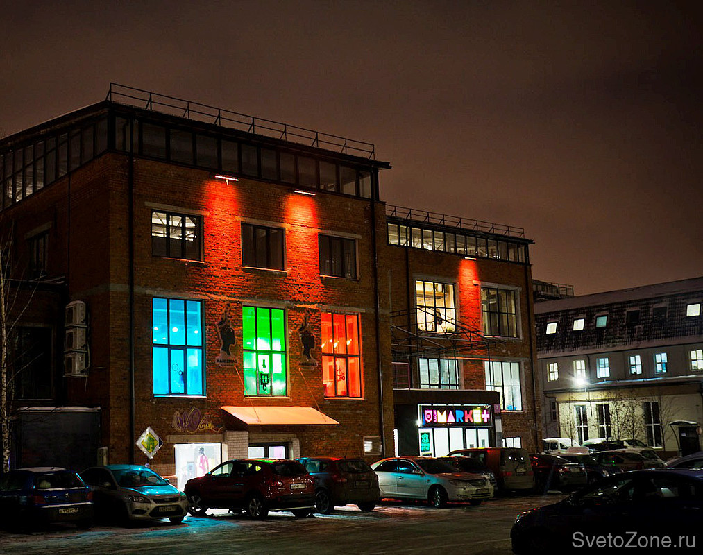 При разработке проекта необходимо было не только привлечь внимание к зданию, подчеркнув особенности творческого подхода к оформлению, но и сделать акцент на фактуре кирпичной кладки фасада (это было одним из условий заказчика). Наиболее оптимальным вариантом в данном случае специалисты посчитали использование светодиодных технологий с применением системы RGB.